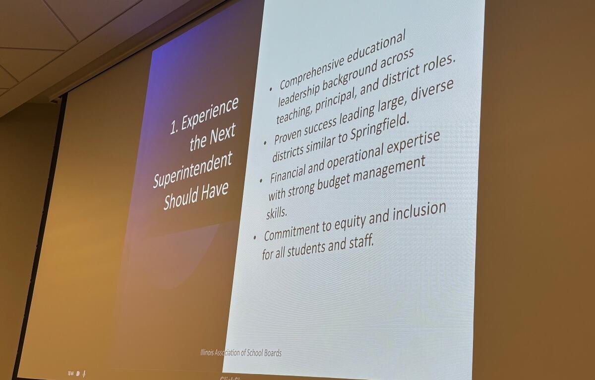 “The thing that is on peoples mind is the finances,” Carmen Ayala of the Illinois Association of School Boards told the Springfield Public Schools board Monday. “Every single group spoke about the deficit, so they want to make sure that the next leader for the school district has a good financial and operational background.”