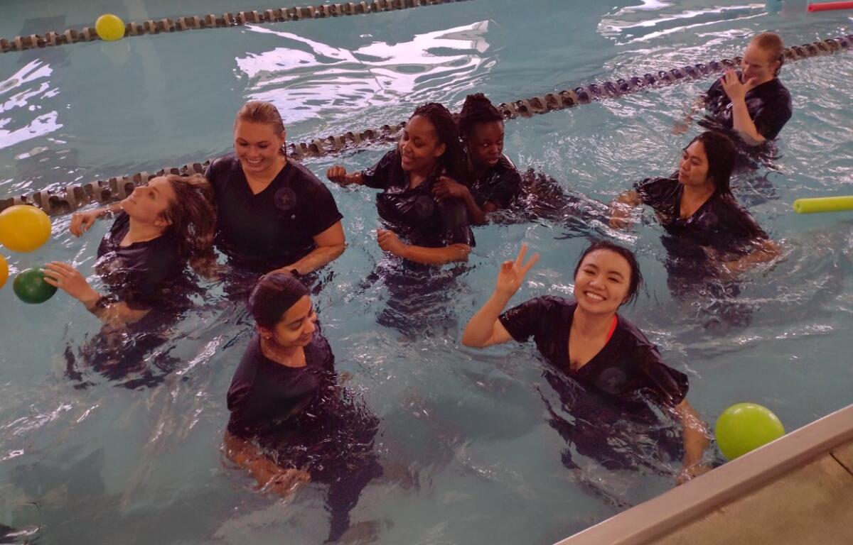 Taking a group plunge, scrubs and all, into the swimming pool at Fit Club South.