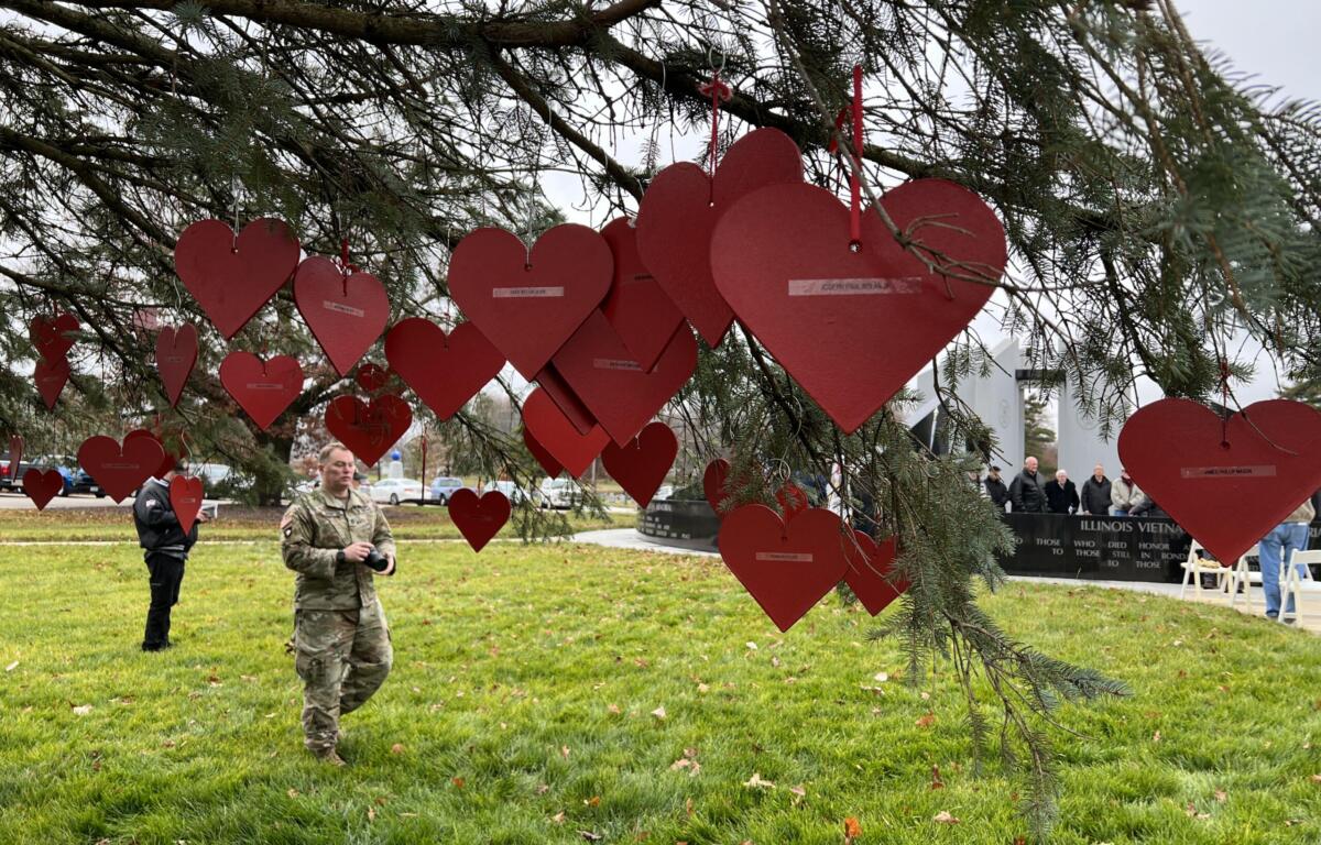Family and friends of soldiers had the opportunity to hang handmade, heart-shaped ornaments with the names of loved ones on a tree near the memorial. The Black Tiger Honor Guard served as the color guard. The names of the POW/MIA soldiers were read aloud, by Mayor Misty Buscher and the ceremony also included music courtesy of the Land of Lincoln Chorus.
