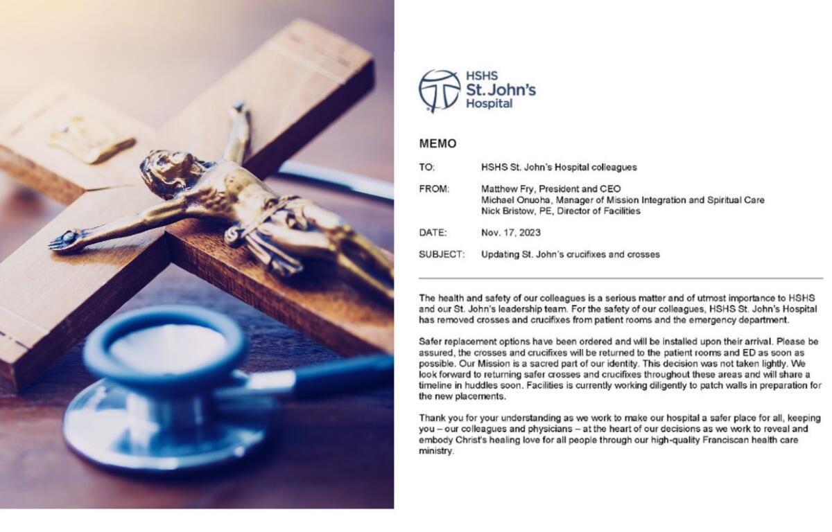 An HSHS St. John’s Hospital memo (pictured) obtained by WTAX News does not go into much detail other than to say that in the emergency department and in all patient rooms, crosses and crucifixes have been removed, pending the arrival of “safer replacements.” The memo does not specify what those will be, or what prompted the decision, but says more information, including a timeline, will be disseminated to staff in huddles.