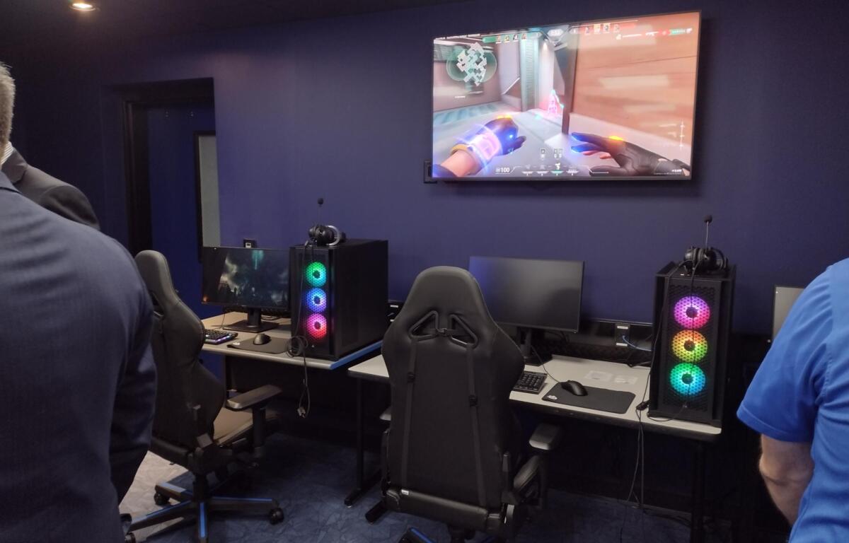 The ‘arena’ features 13 gaming stations, ambient lighting, walls covered in big screen monitors for spectators and a high-tech sound system.
