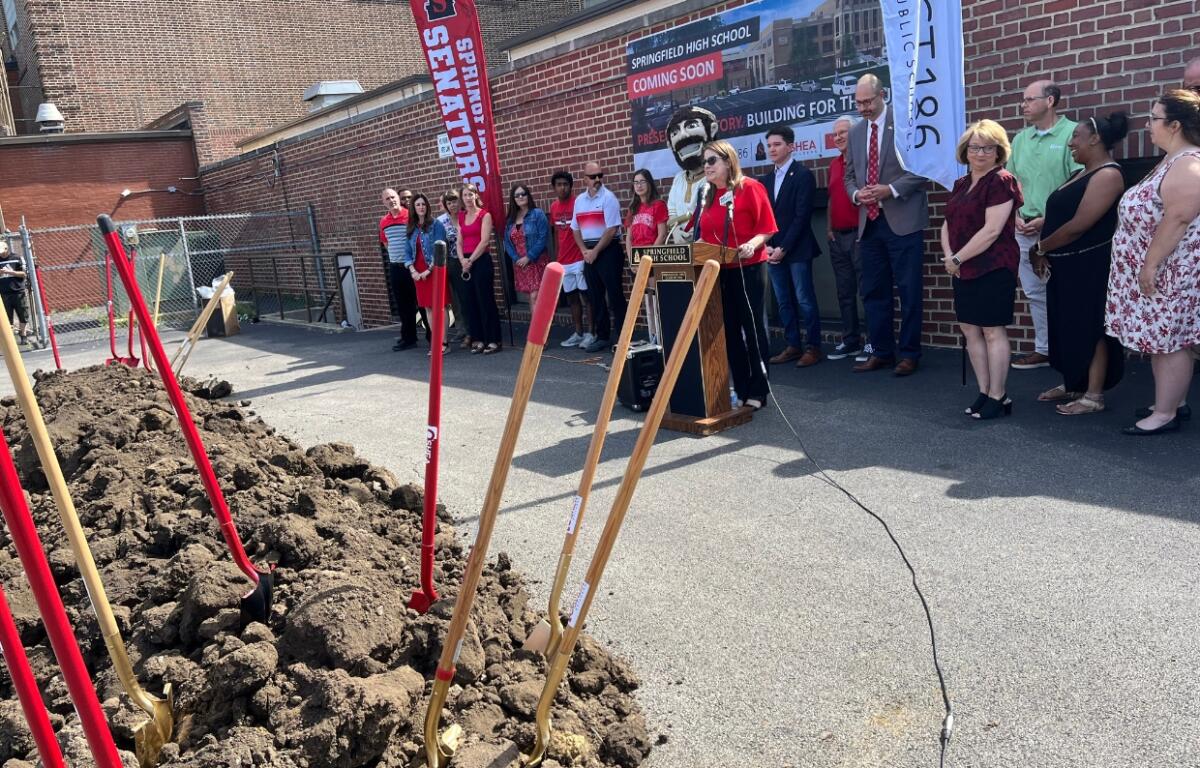 After a groundbreaking ceremony – actually more of a dirt-turning, as a pile of dirt sat on a parking lot – Friday morning, principal Lisa Leardi (pictured, at mic) told WTAX News about the important and special place SHS holds in Springfield.