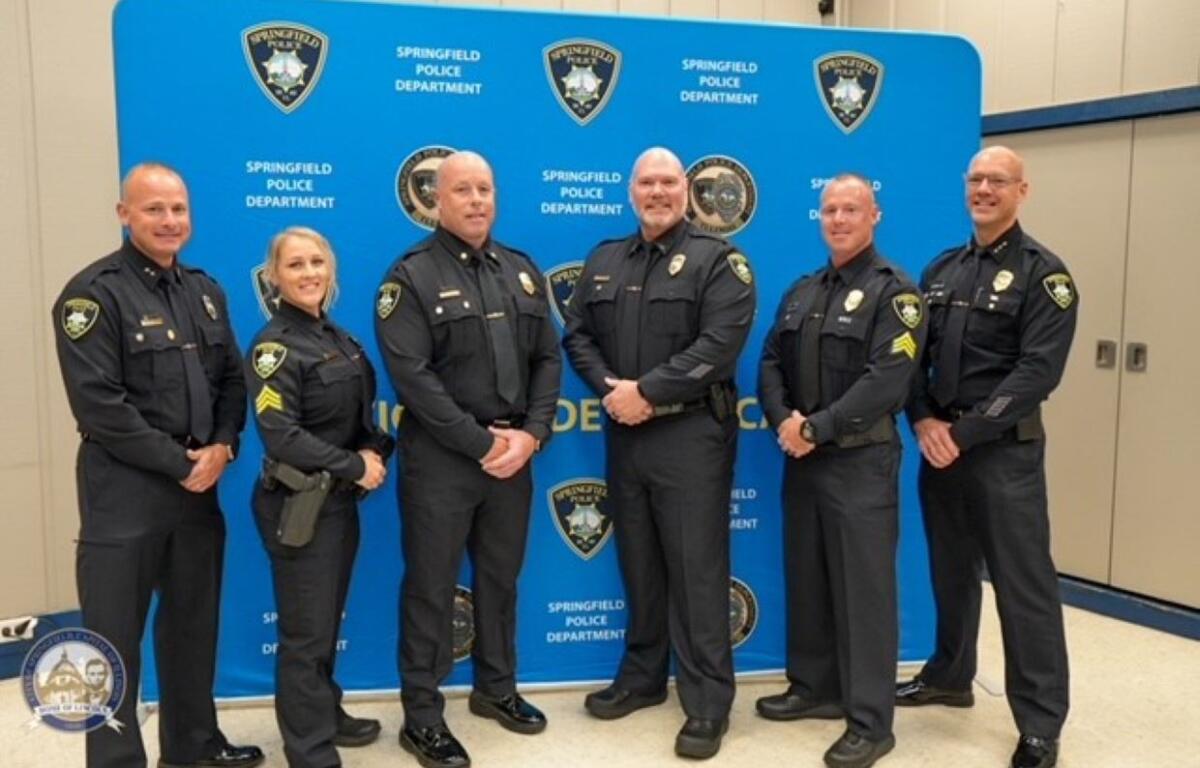 Springfield, ILĀ (CAPITOL CITY NOW) – Five officers with the Springfield Police Department were promoted Wednesday. Mayor Misty Buscher and Chief Ken Scarlette promoted Commander Joe Behl to Assistant Chief, Lieutenant Ryan Leach to Commander, Sergeant Jason Oldham to Lieutenant, and officers Kris Hughes and Lindzee Carpenter to Sergeant.