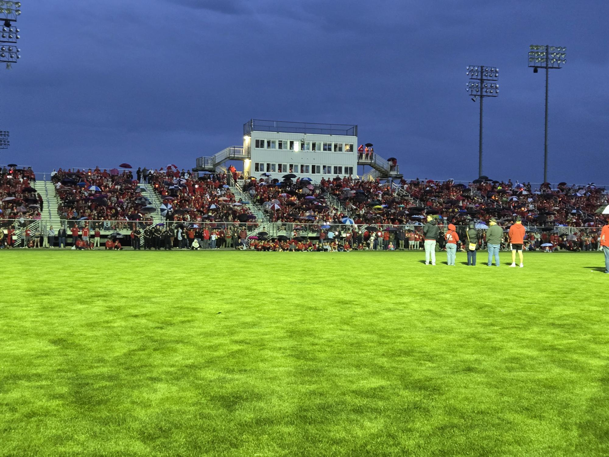 The stands were illuminated by hundreds of electric candles and cell phones lit in honor of absent friends.