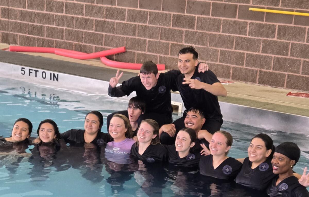 Springfield, IL (CAPITOLCITYNOW) – 13 soon-to-be grads of University of Illinois – Chicago nursing program let off 2 years’ worth of steam by collectively jumping into the pool at Fit Club on S. 6th while fully dressed in their nursing scrubs.