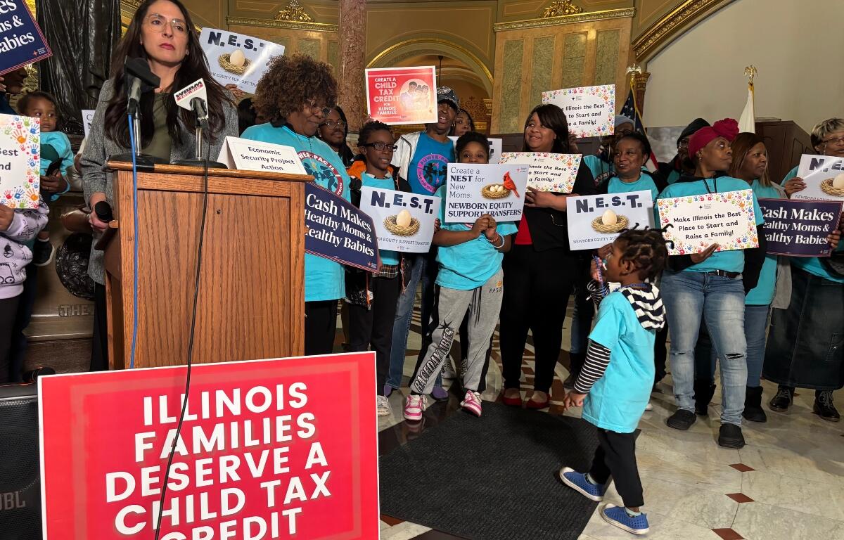 “That, we know, is helpful to get diapers, to pay for bus fare or put gas in your car to get to those appointments to care for your child,” said Sarah Saheb (pictured, left) of Economic Security Illinois Action, which held a rally and news conference in the Capitol Rotunda.