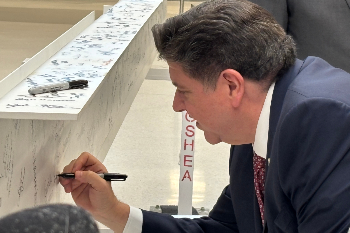 Pritzker visits Sangamon County Complex to sign transportation hub beam.