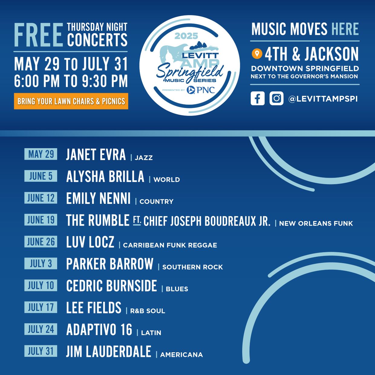 Levitt AMP Springfield Concert Series is a free family-friendly concert series with new headliners playing every Thursday night through the summer.